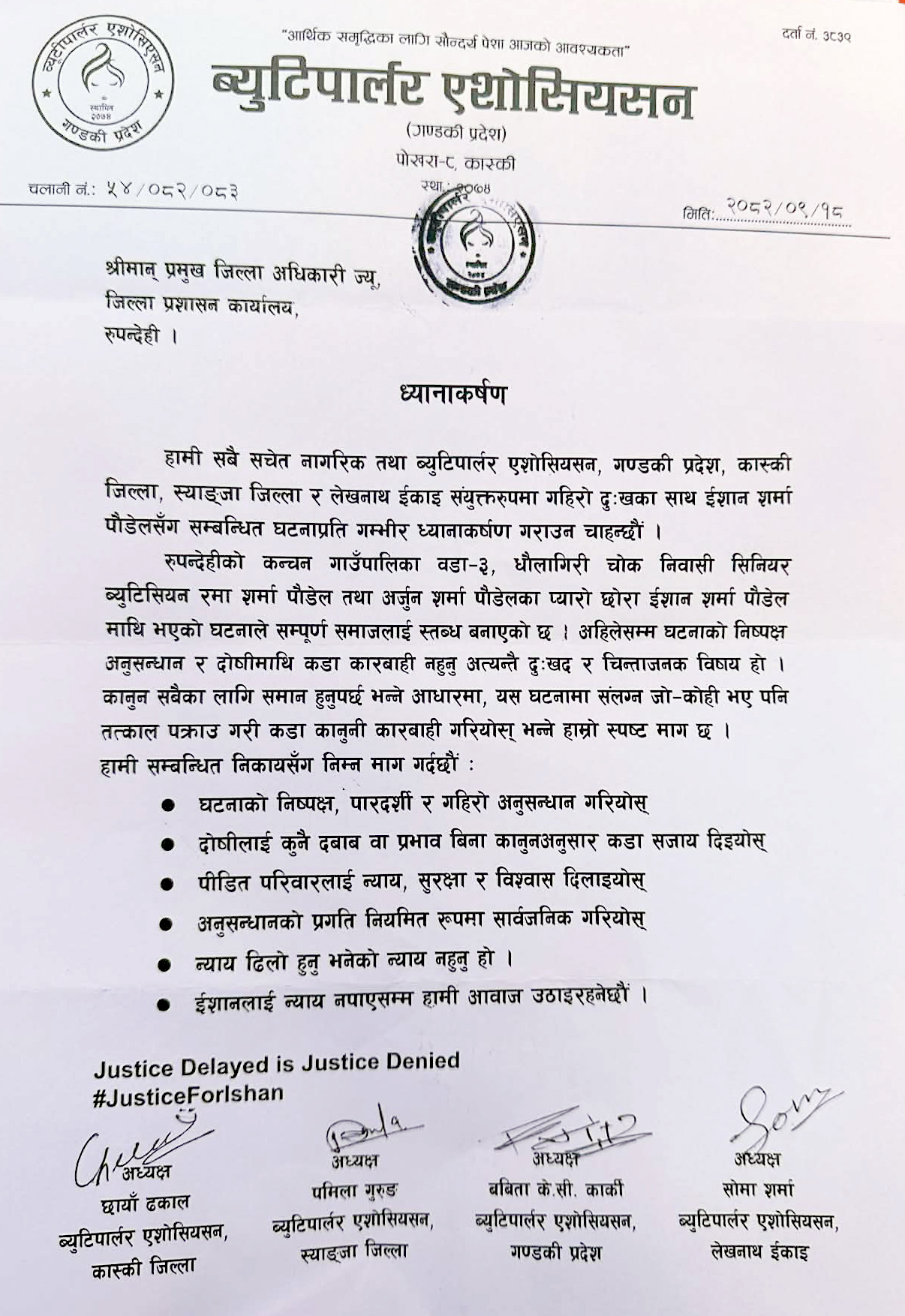 ब्युटिपार्लर एसोसिएसनद्धारा इशानको मृत्युको निष्पक्ष छानबिनको माग