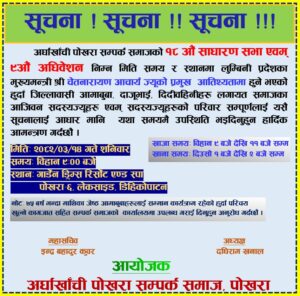 …यदि तपाई पनि अर्घाखाँची जिल्लादेखि विभिन्न सिलसिलामा पोखरा आएर बसोवास गरि अर्धाखाँची समाज सँग जोडिनु भएको छ भने यसैलाइ सुचनाको आधार मानेर उपस्थित भैदिनुहोला तर अझै सम्म समाज सँग जोडिनु भएको छैन भने पनि मन नअलमलाई ढुक्क भएर आउनुहोला ।